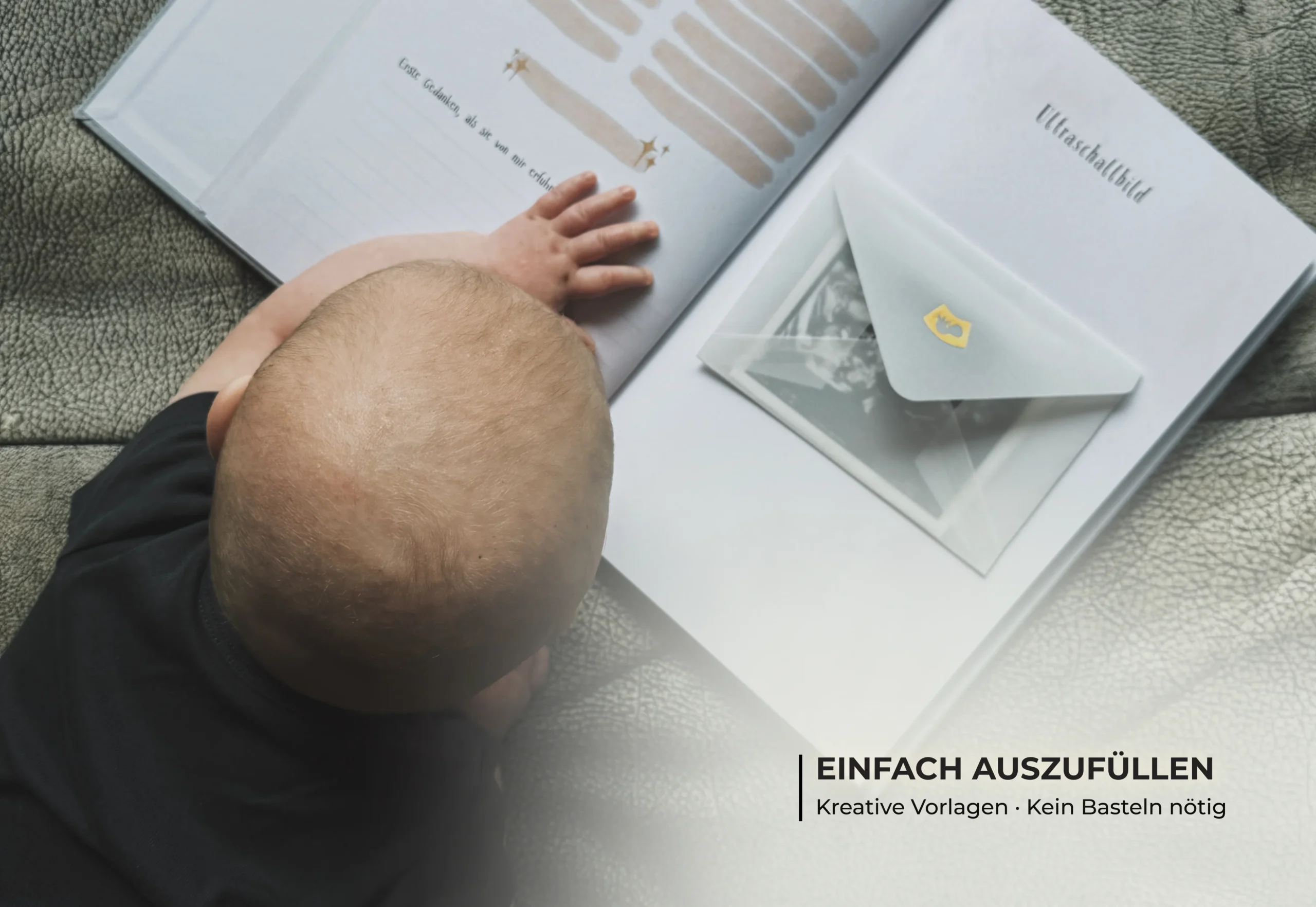 5 Plätze zum Einkleben von Umschlägen für Erinnerungsstücken wie Ultraschallbild, Haarlocke, Krankenhausbändchen, Brief von den Eltern, Wünsche von Familie