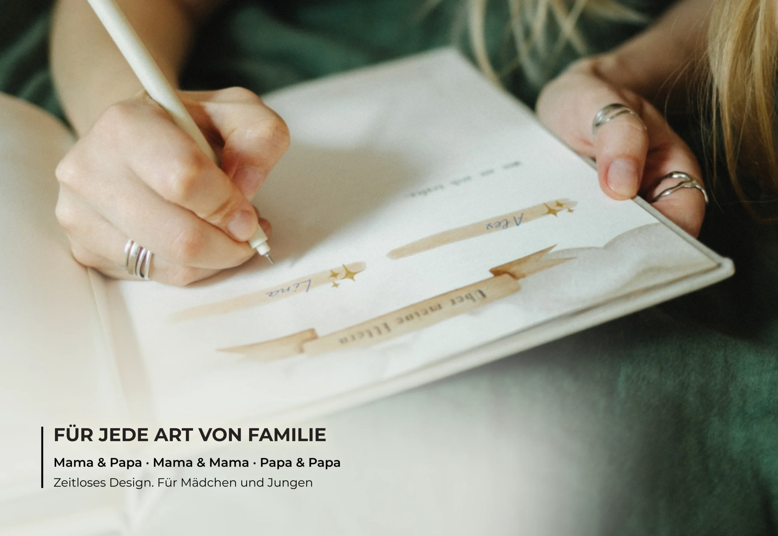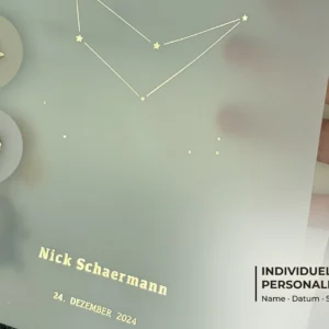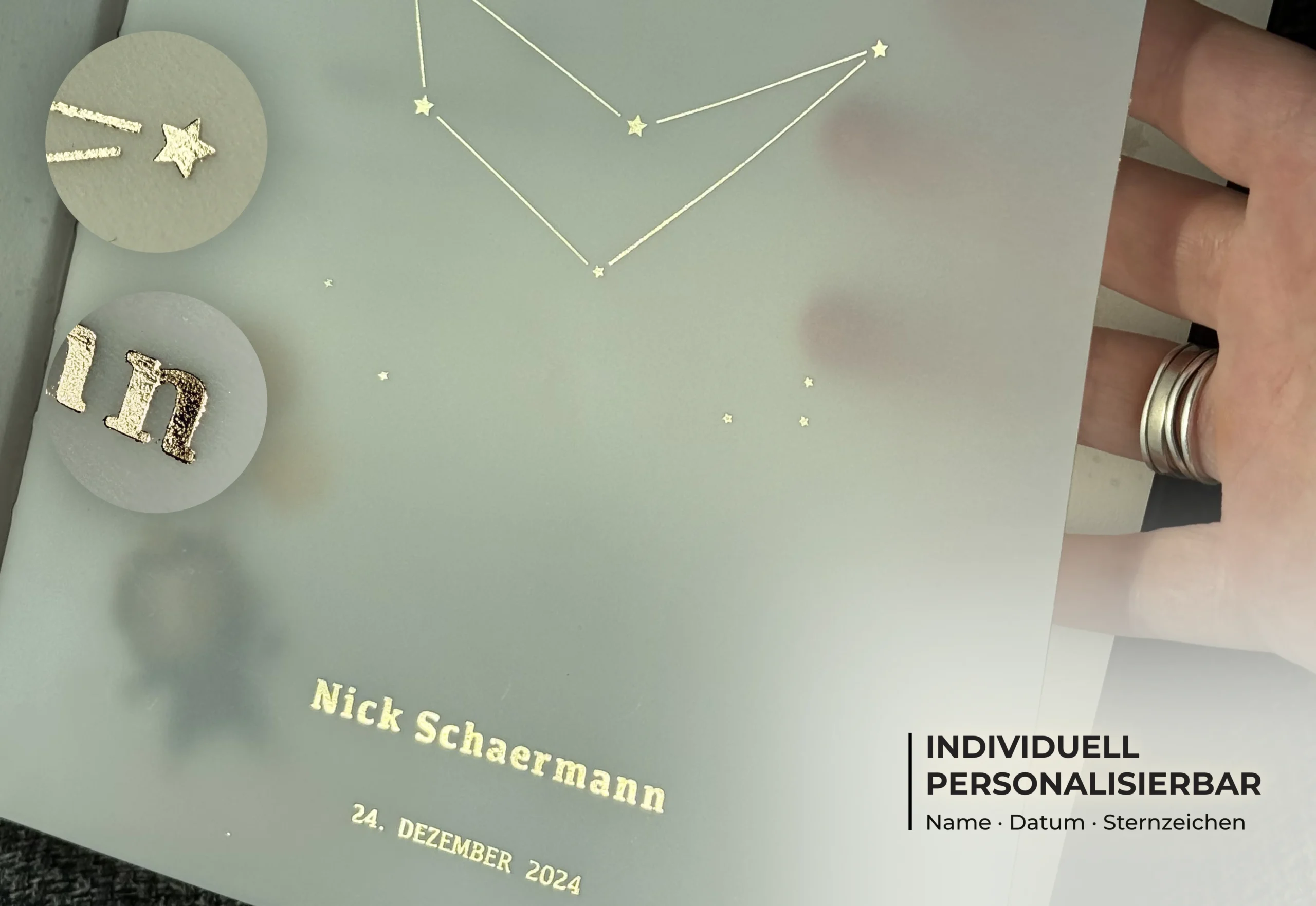 Die erste Seite besteht aus seidig-mattem, halbtransparentem Vellum – hier wird die Personalisierung (Sternzeichen, Name, Geburtsdatum) geprägt
